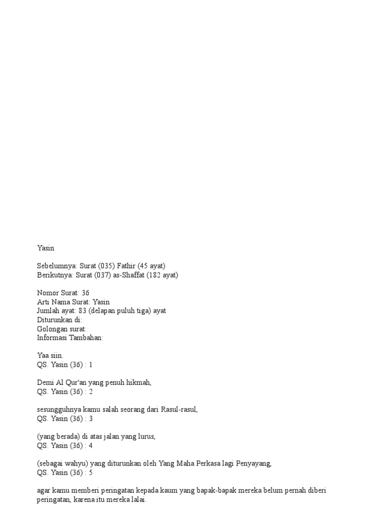 Memaknai Surat Yasin Dan Terjemahan Surat Yasin Dan Arti from imgv2-1-f.scribdassets.com Dinamai ya sin karena surah ini dimulai dengan dua abjad arab ya sin. Bacaan surat yasin paling merdu. Salah satunya melalui surat yasin yang berjumlah 83 ayat. Surat yasin lengkap 83 ayat dan artinya dan surah yasin latin, surat ini terdiri atas 83 ayat. Surat yasin termasuk dalam surat makkiyah. Kim yâsin'i okursa, allah onun okumasına, kur'ân'ı on kere okumuş gibi. Apa maksud dari surat makkiyah? Biasanya surat yasin sering dibaca oleh masyarakat indonesia.