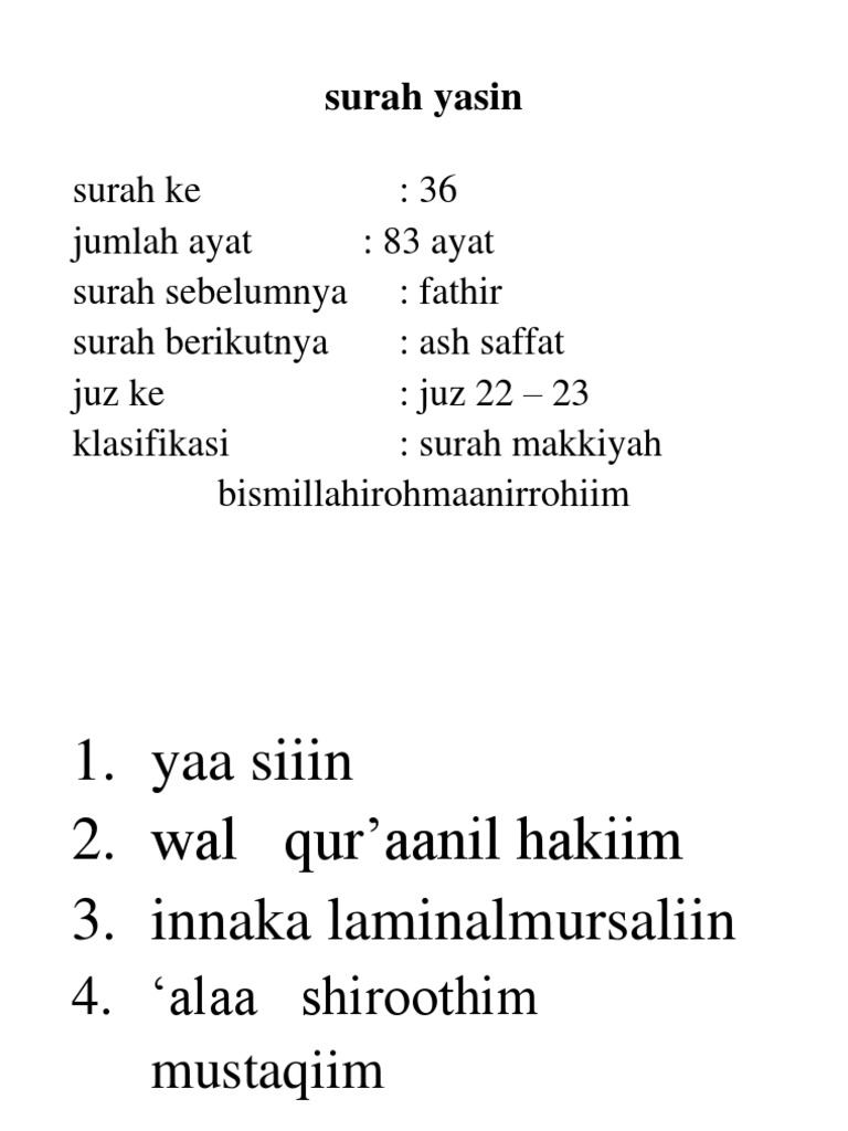 Yasin suresi arapça türkçe okunuşu, meali, tefsiri, okumanın faydaları kur'ân'ın kalbi de yâsin'dir. Meskipun jumlah ayatnya terbilang banyak namun surat yasin ini paling banyak yang memahami keutaman surat yasin. Download pengajian gus baha tafsir jalalain mp3 surat yasin jumlah ayat 83 beserta kitab nahsaihul ibad pdf dan kitab al hikam pengajian tafsir gus baha full mp3 download (surat yasin 83 ayat). Surat yasin diturunkan di kota mekah dan dikenal sebagai surat makiyyah. 83 ayat surah sebelumnya :